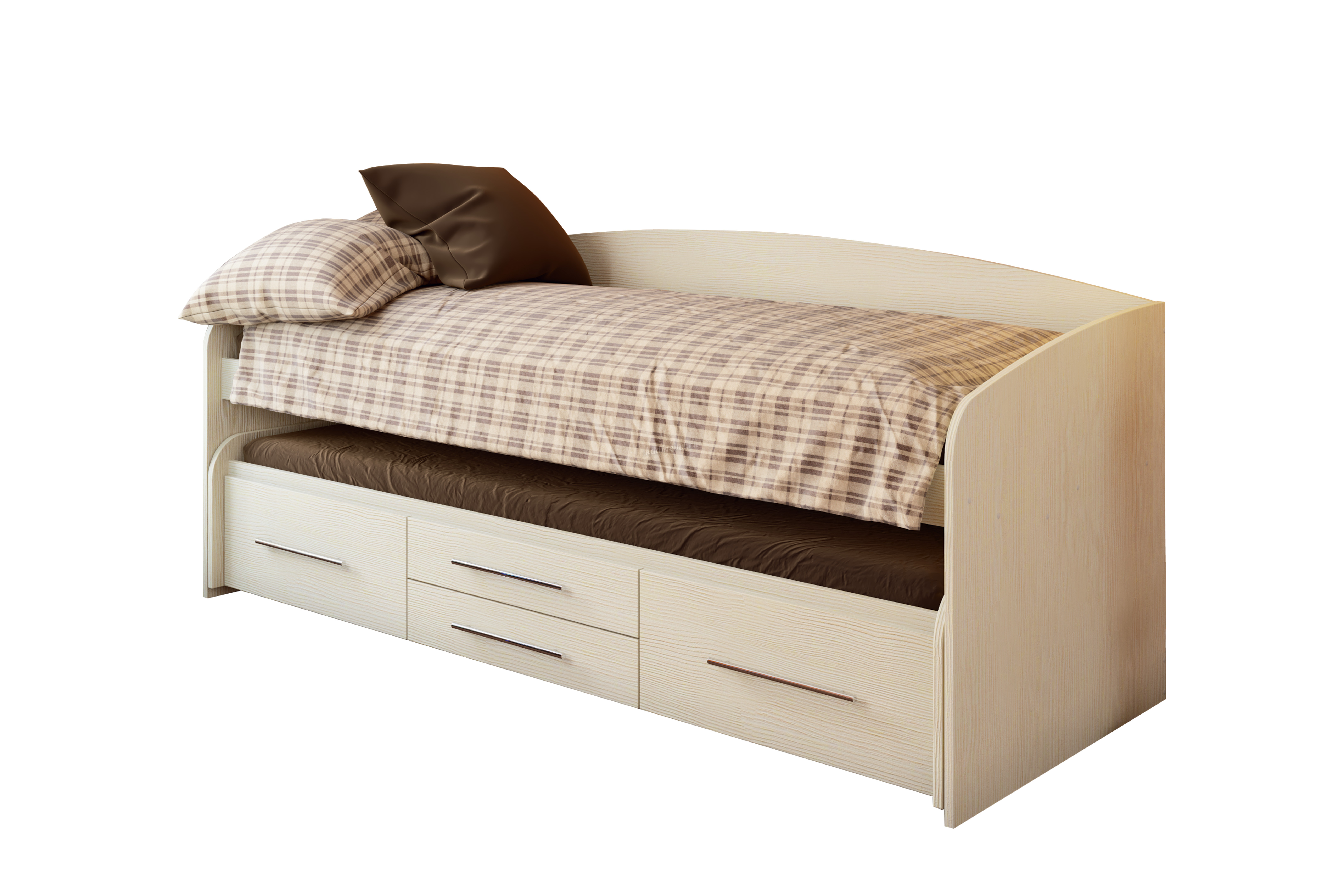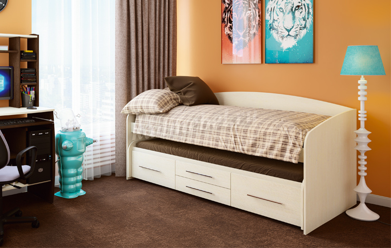 Двухъярусная детская кровать «Адель-5» имеет весьма необычную компоновку. У неё выдвижное нижнее спальное место, благодаря чему общая высота кровати составляет всего 66 см. Нижний блок оснащён двумя парами больших и малых выдвижных ящиков для постельных принадлежностей, а также колёсиками, поэтому для его выдвигания вам не потребуется значительных усилий. Размеры спальных мест отличаются. Кровать оборудована боковинами и задней спинкой.