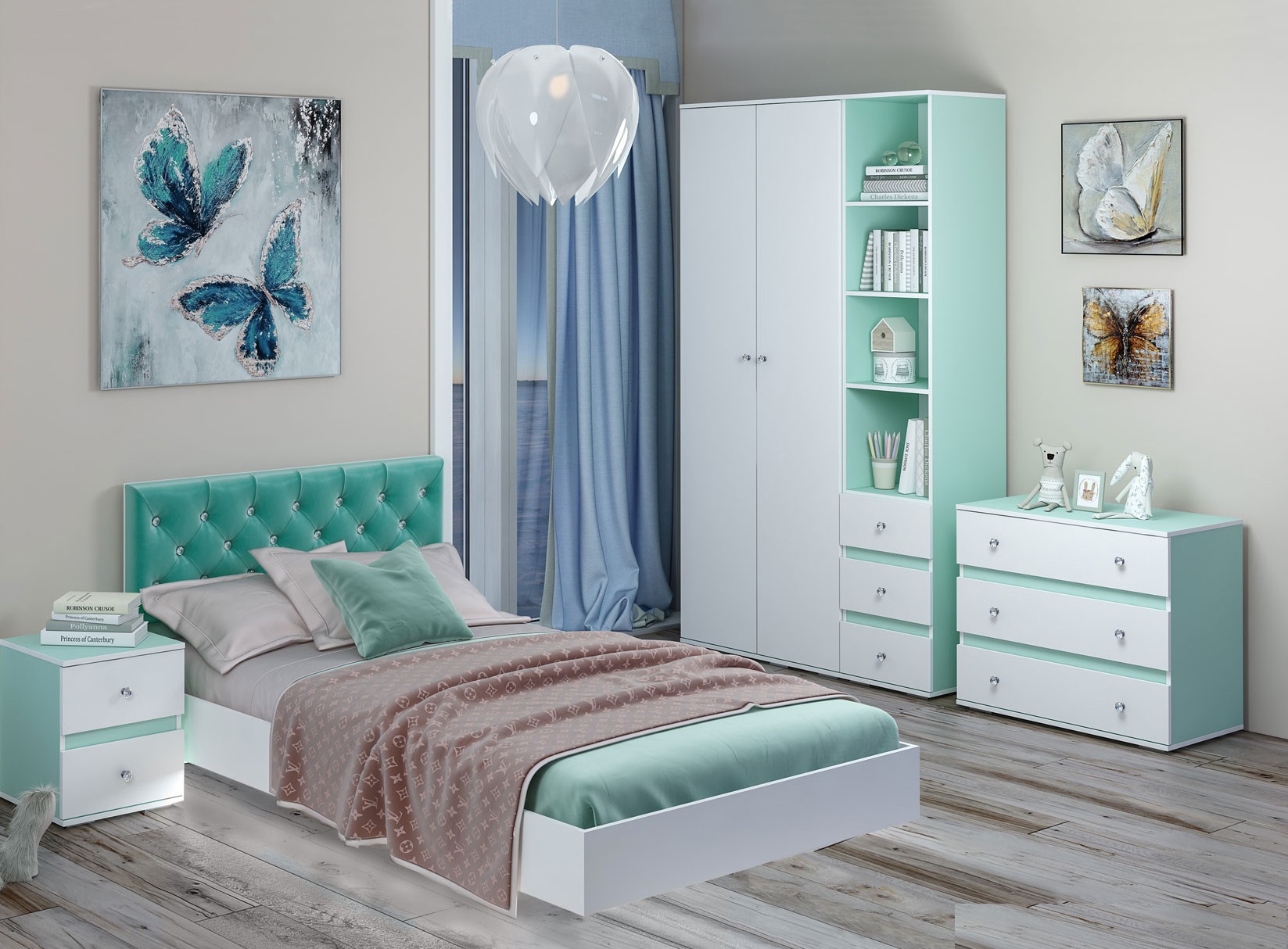 Модульная система для детской комнаты Тифани создана как для девочек раннего школьного возраста, так и для периода взросления. Нежно-бирюзовые тона корпусов коллекции в обрамлении снежно-белой кромки идеально гармонируют с белыми фасадами, украшенными ювелирными ручками.