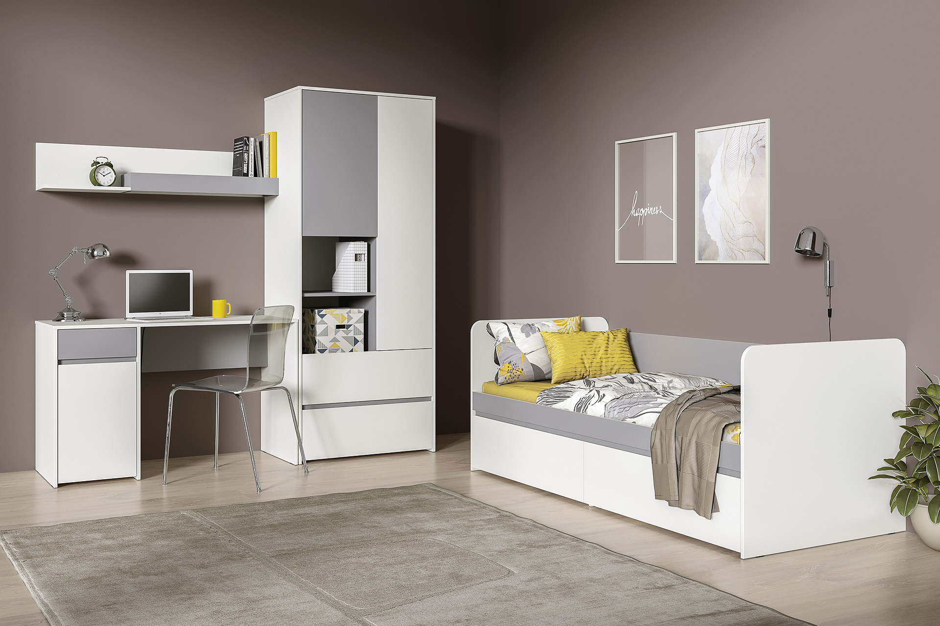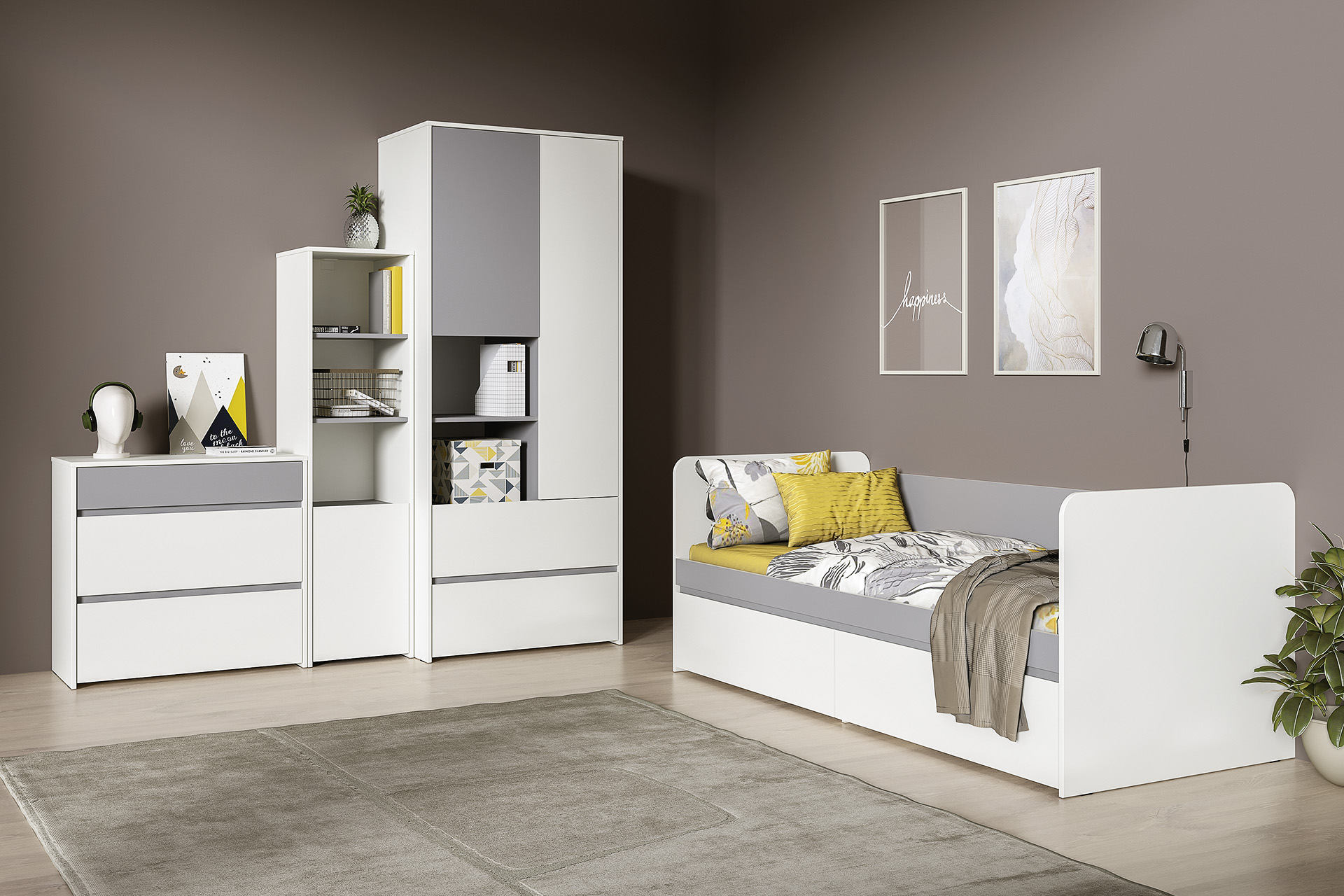 Базовый белый цвет, сочетаясь с акцентным серым, создаёт нейтральную основу для приятного интерьера, чтобы подчеркнуть личные вещи и аксессуары.