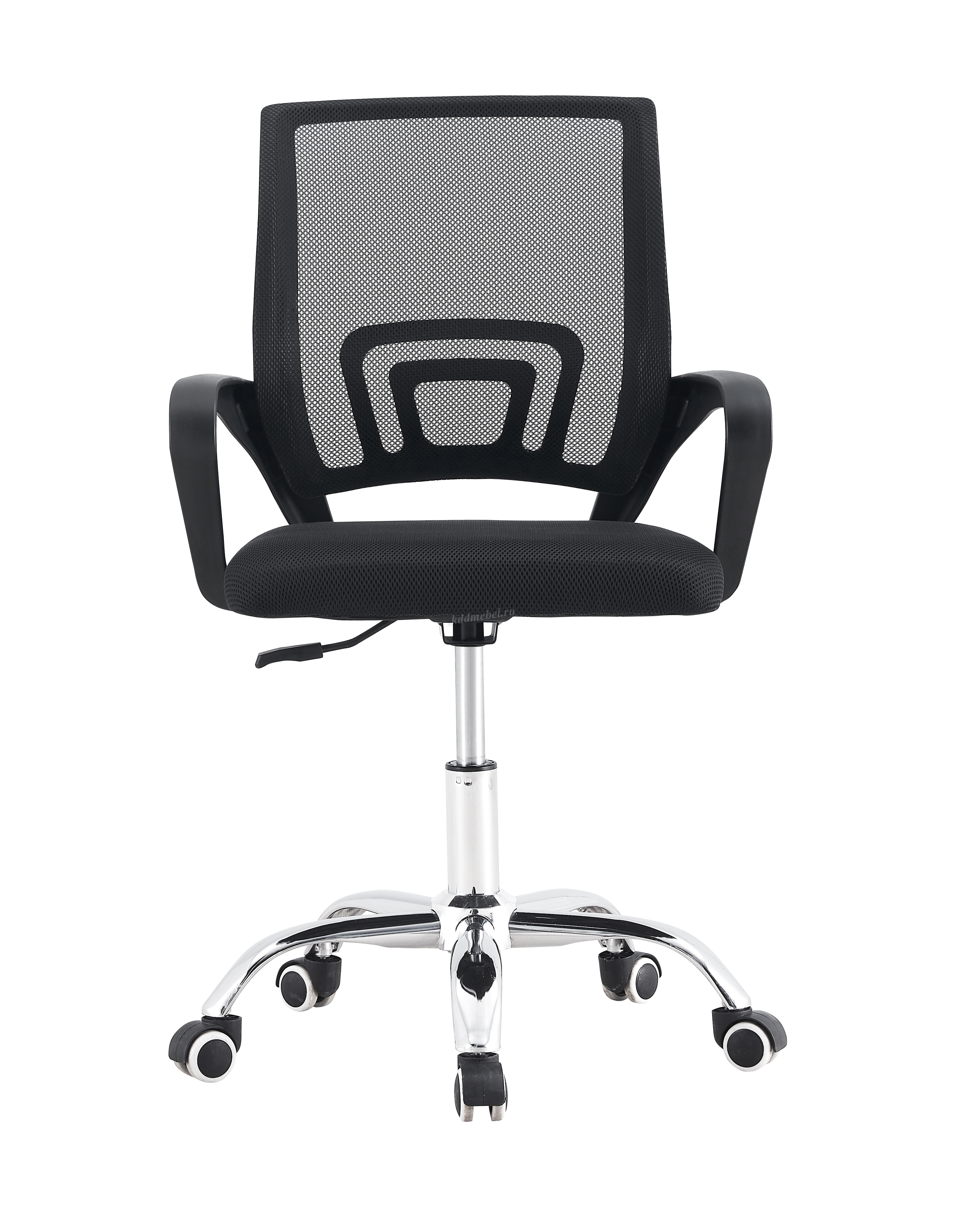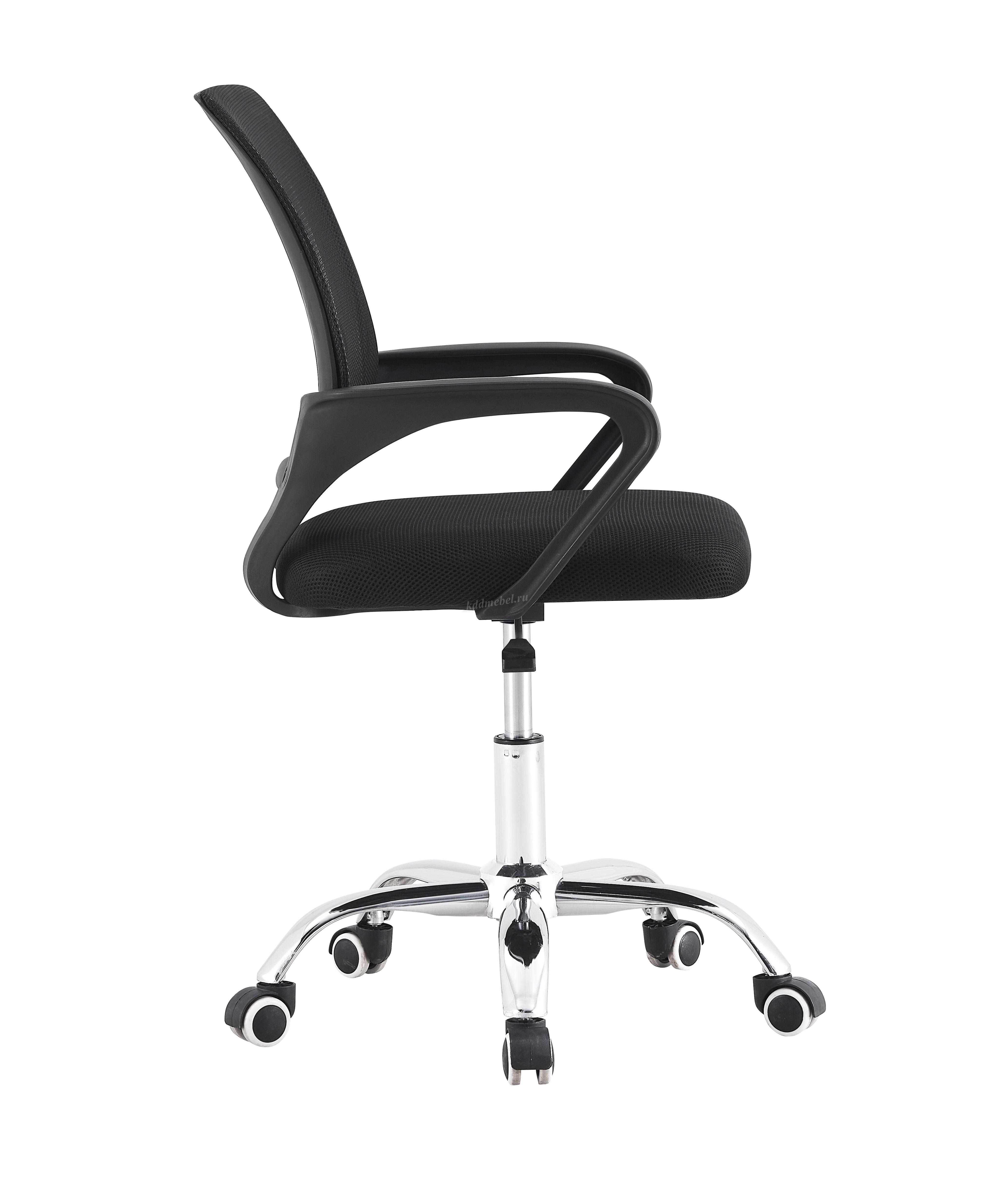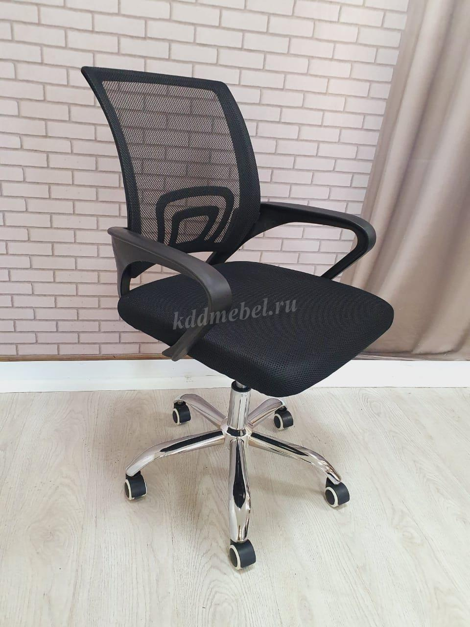 Современное офисное кресло с удобной спинкой, сиденьем из акриловой сетки и устойчивым пятилучным хромированным основанием, снабжённым 50-мм двойными колёсиками.
