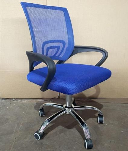 Современное офисное кресло с удобной спинкой, сиденьем из акриловой сетки и устойчивым пятилучным металлическим основанием, снабжённым 50-мм двойными колёсиками.