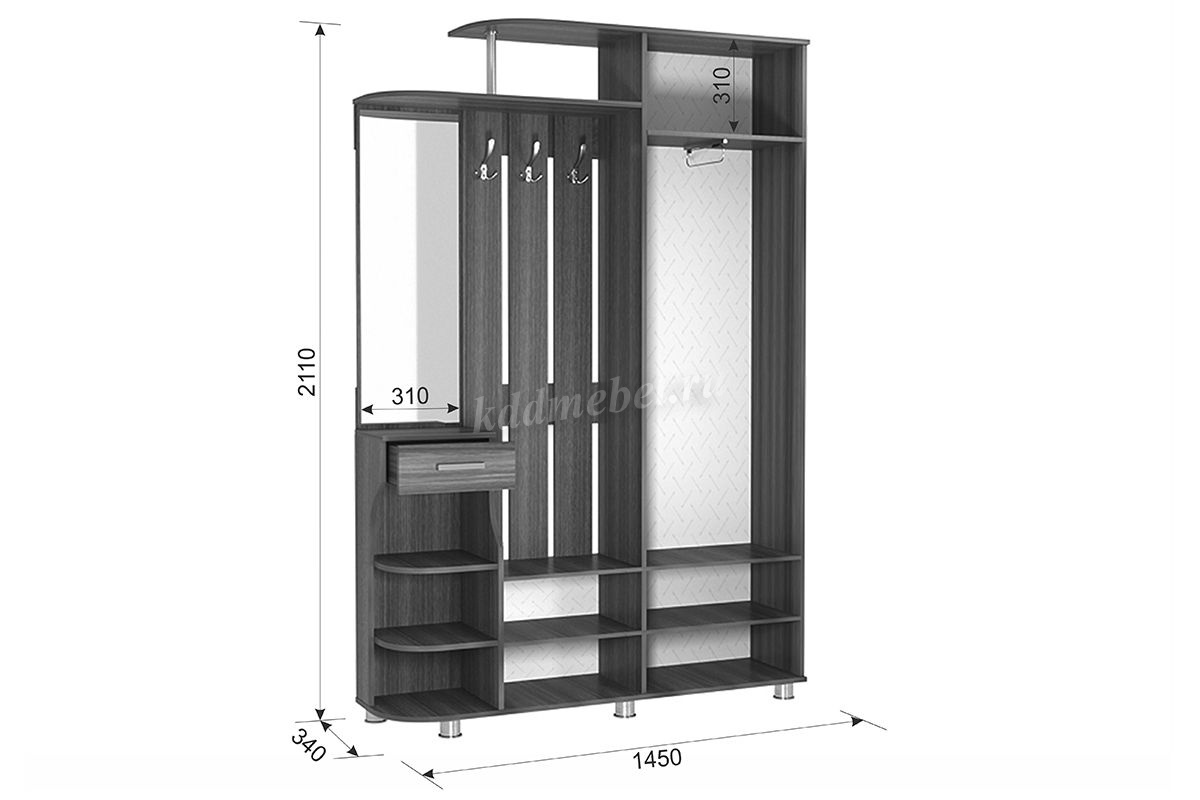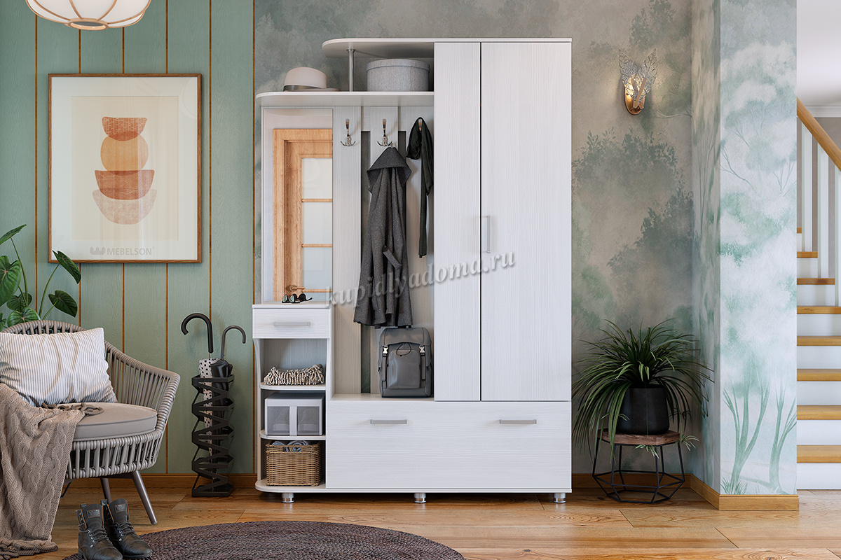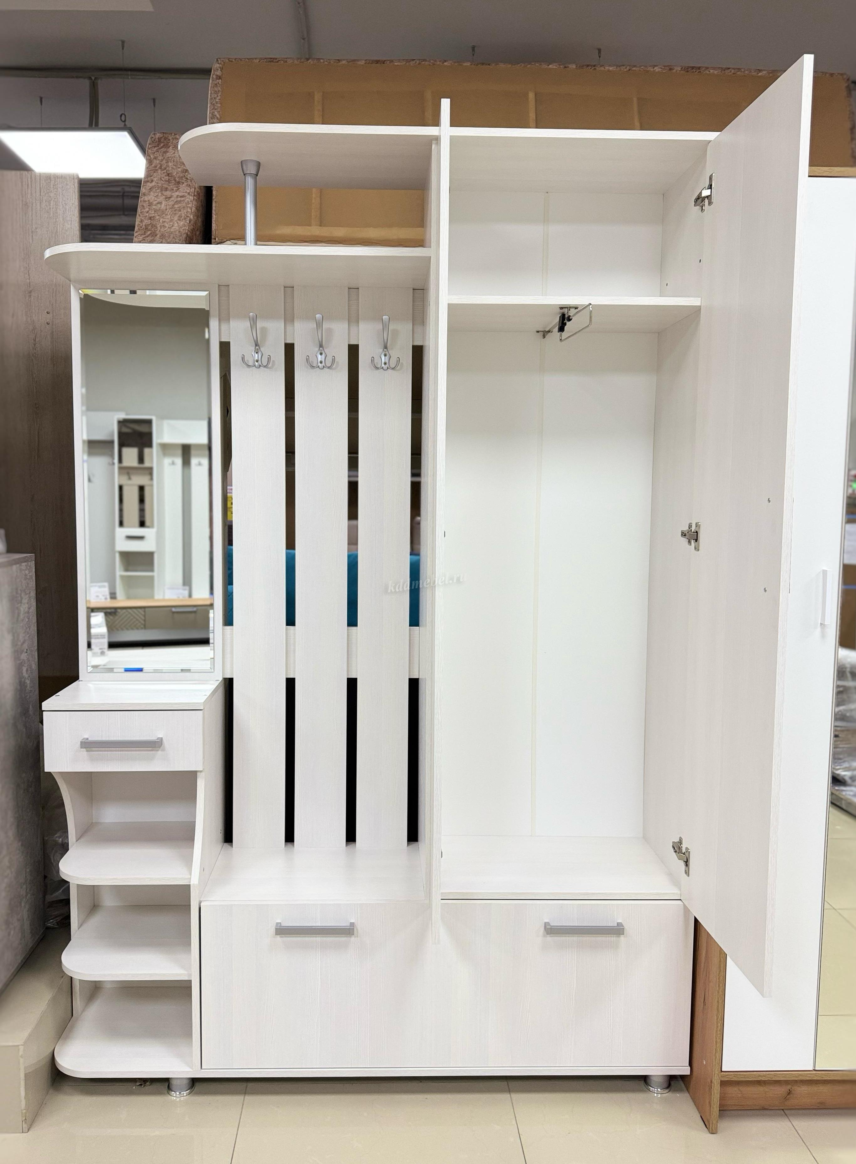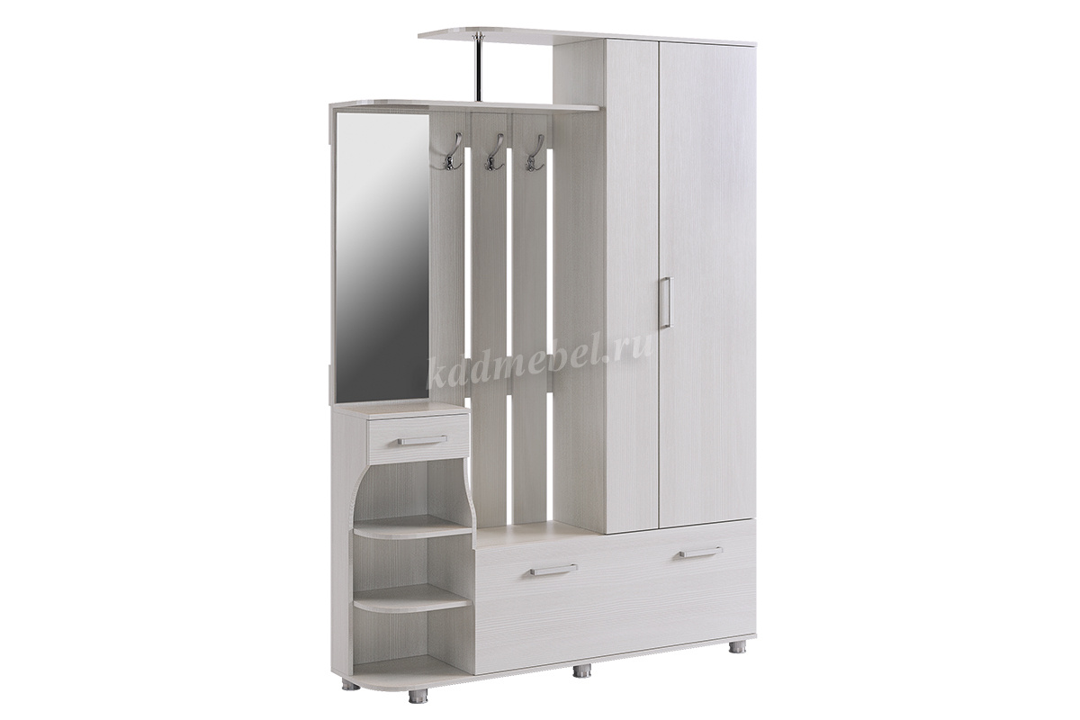 Состоит из: шкафа с выдвижной штангой, вешалки с крючками для одежды и сумок, обувницы, открытых полок, зеркала, полки для головных уборов, выдвижного ящика. Сборка универсальная.