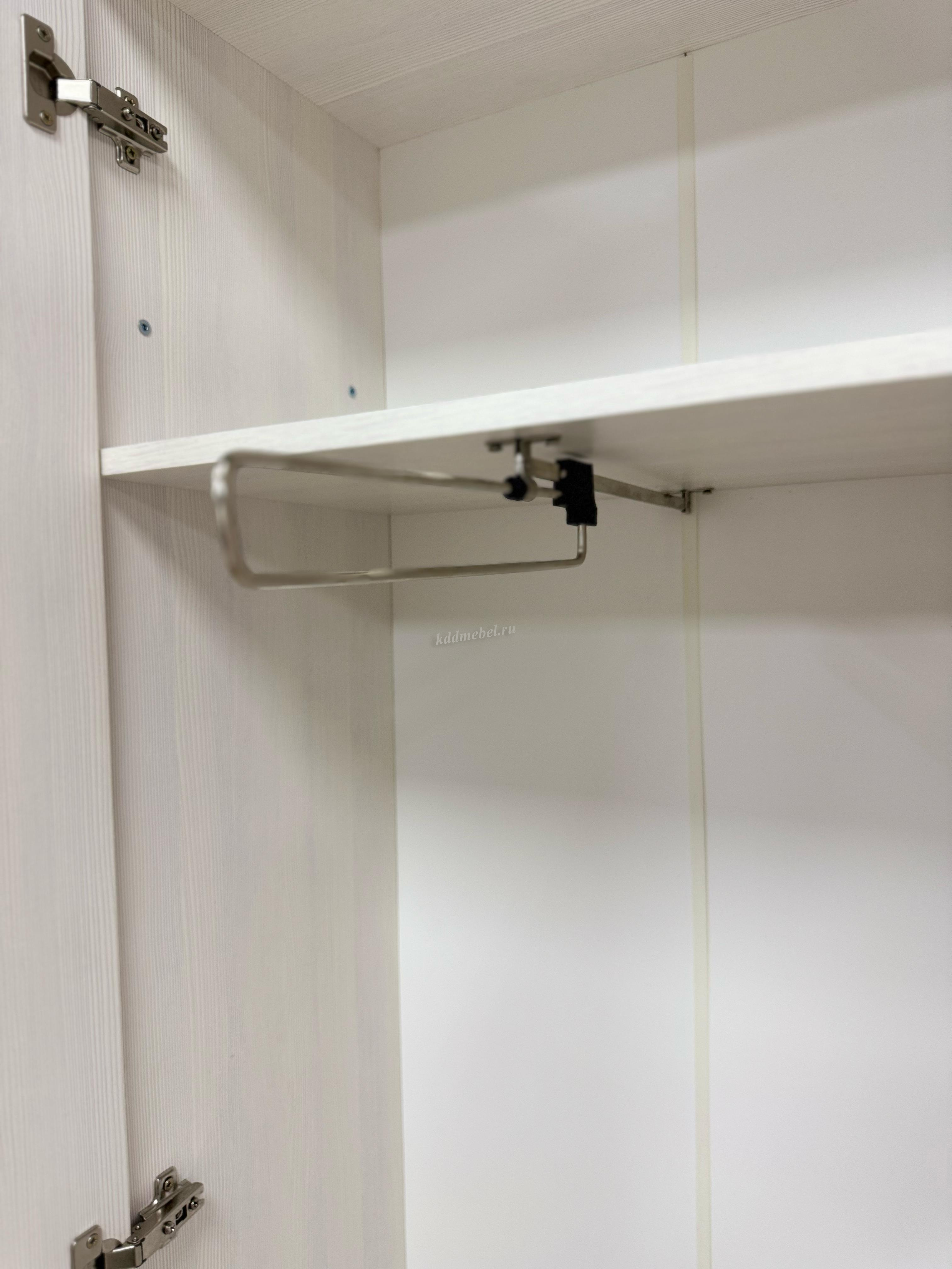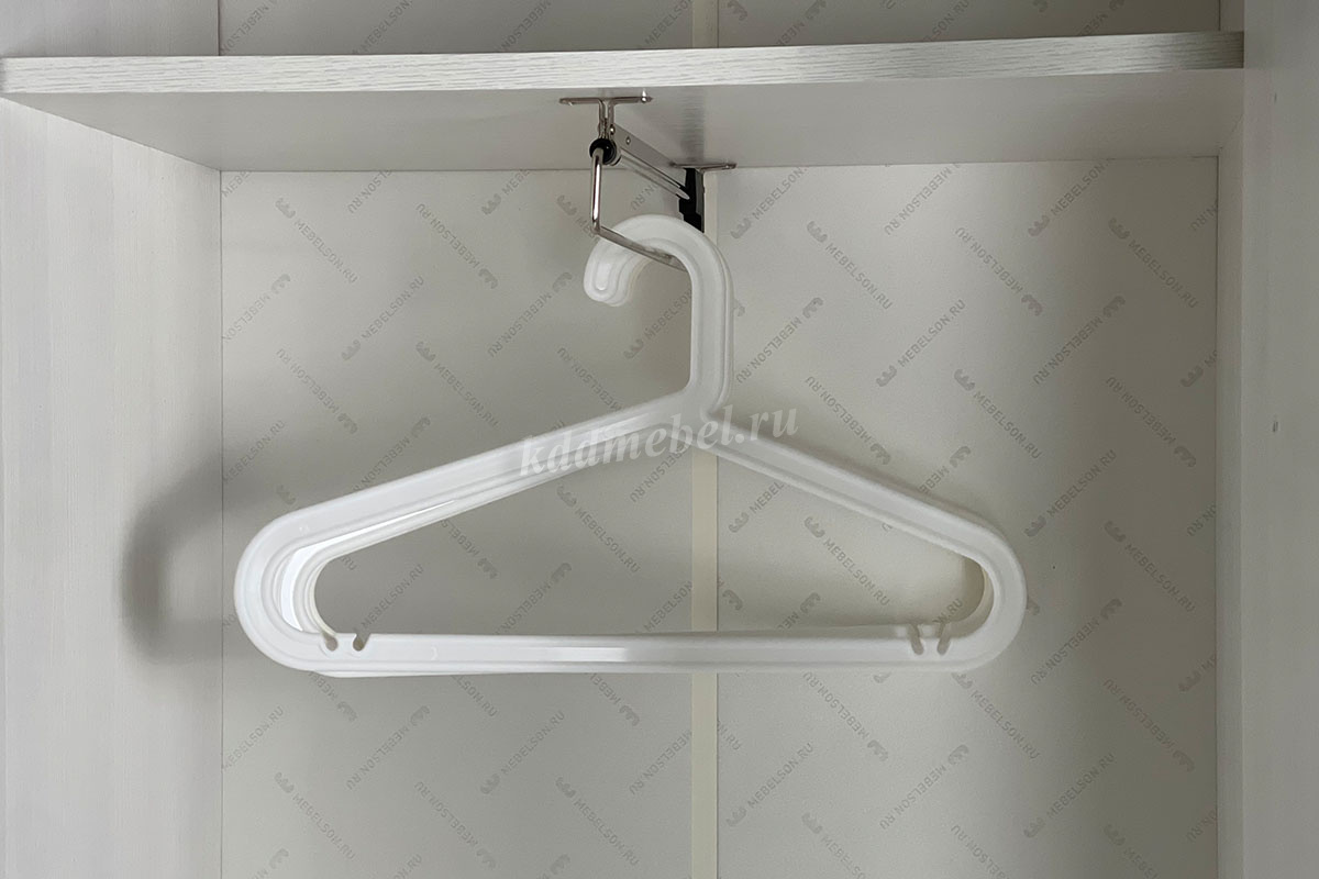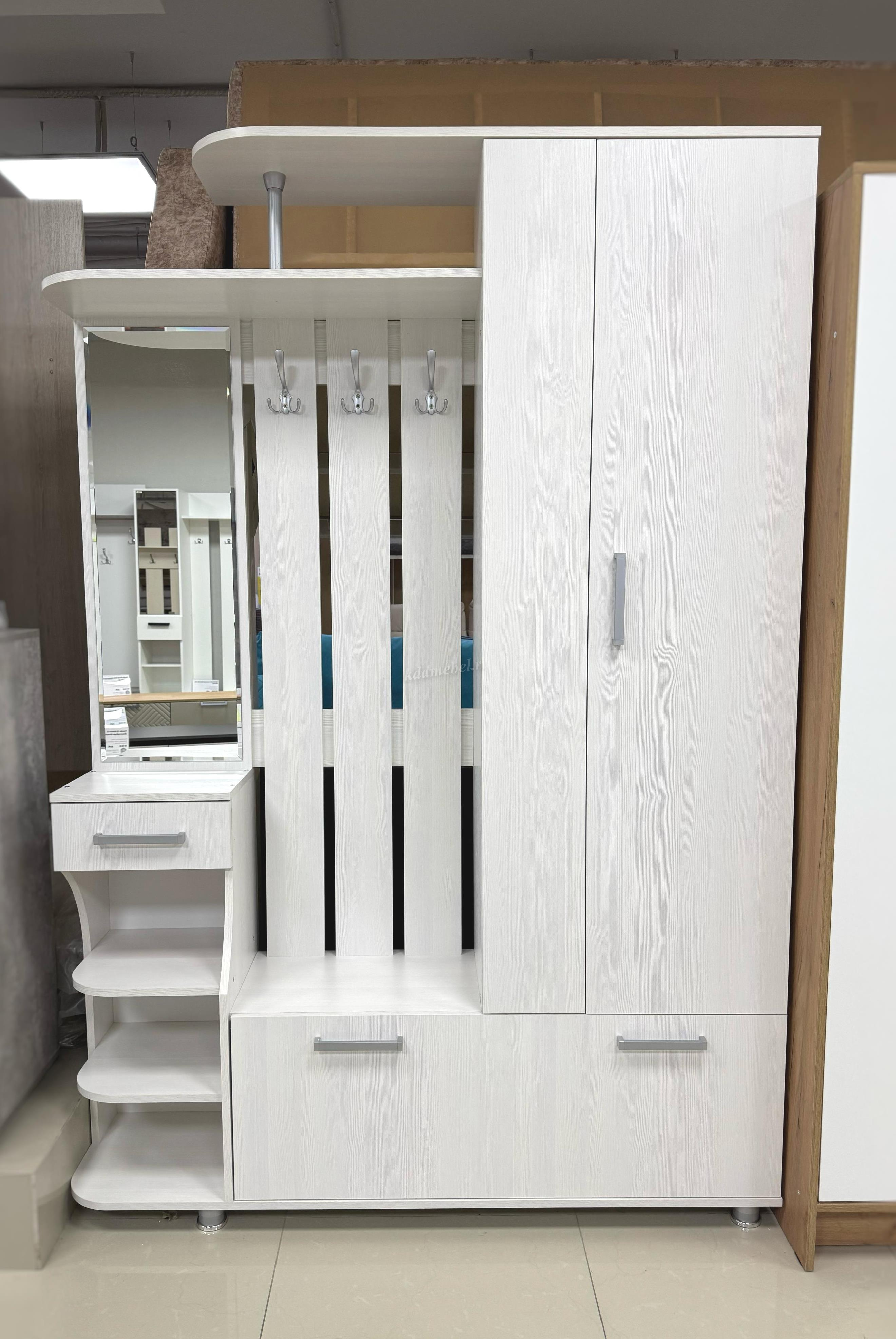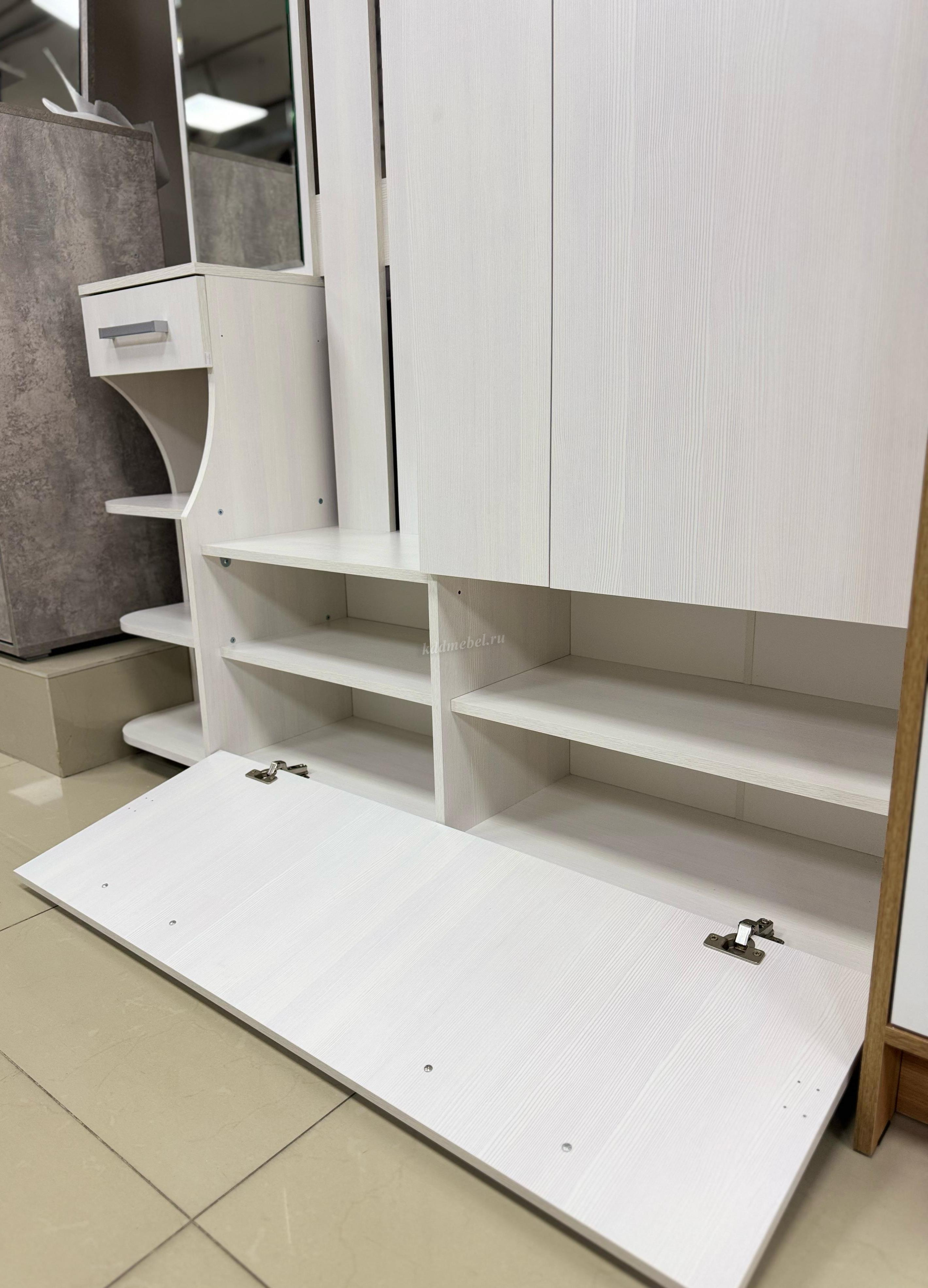 Состоит из: шкафа с выдвижной штангой, вешалки с крючками для одежды и сумок, обувницы, открытых полок, зеркала, полки для головных уборов, выдвижного ящика. Сборка универсальная.