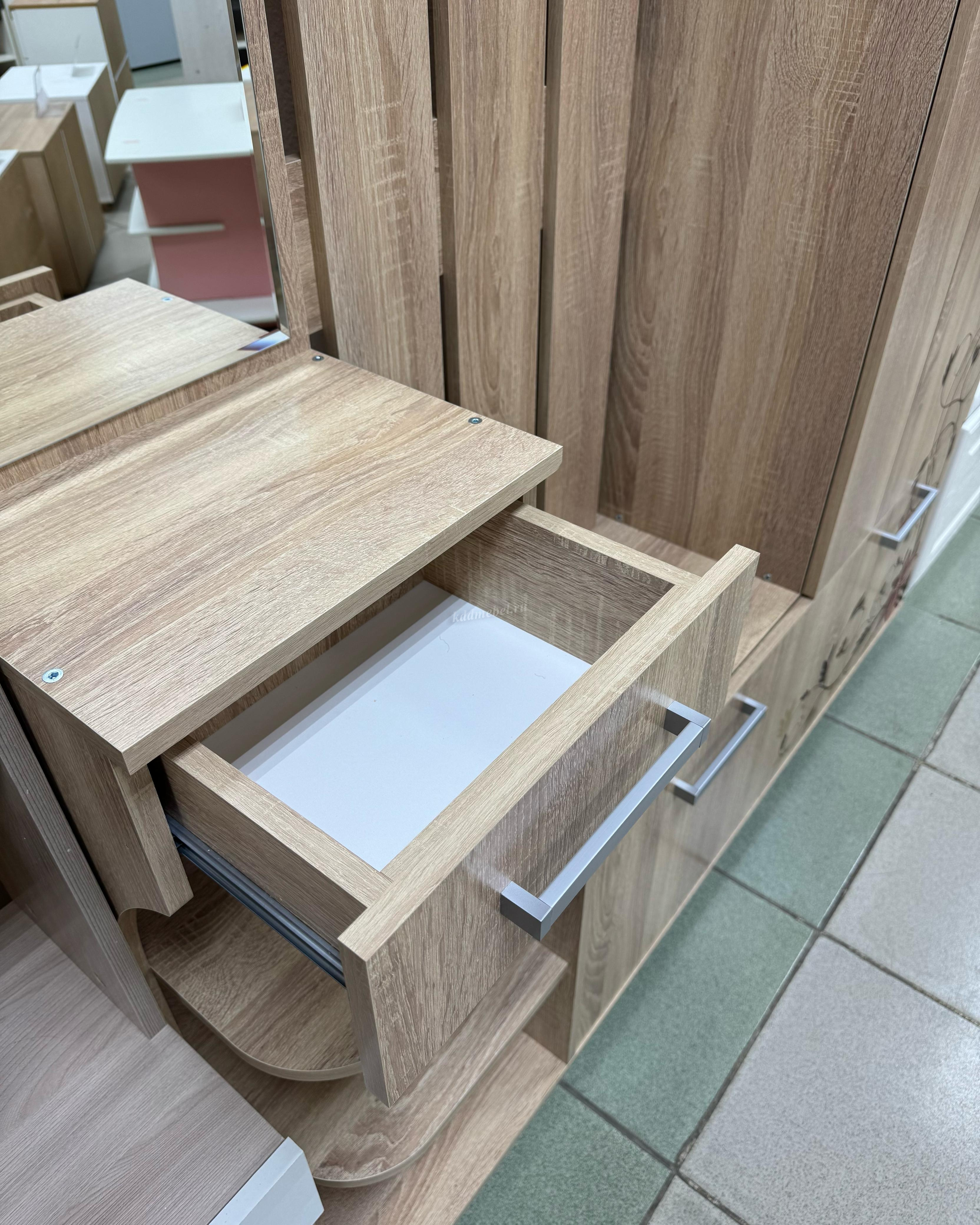 Состоит из: шкафа с выдвижной штангой, вешалки с крючками для одежды и сумок, обувницы, открытых полок, зеркала, полки для головных уборов, выдвижного ящика. Сборка универсальная.