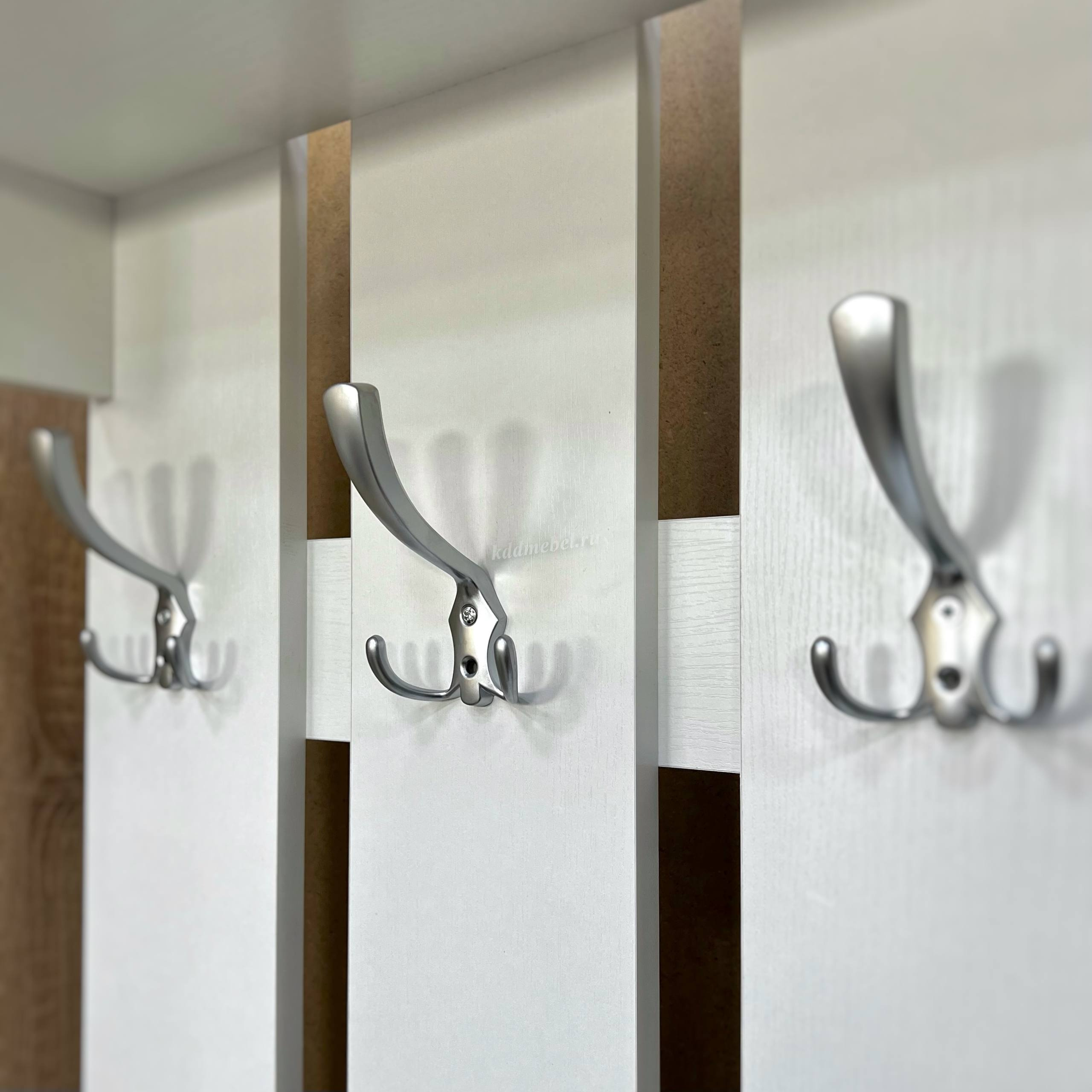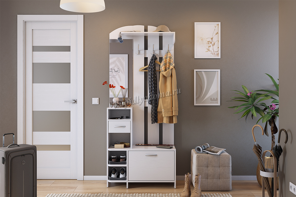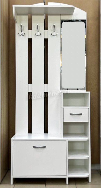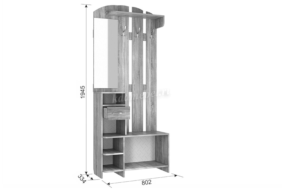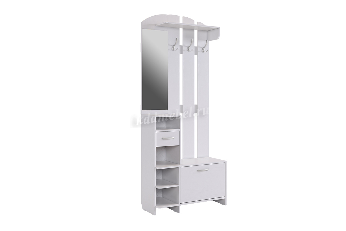 Состоит из: полок, вешалки с крючками для одежды и сумок, обувницы, открытых полок, зеркала, полки для головных уборов, выдвижного ящика.