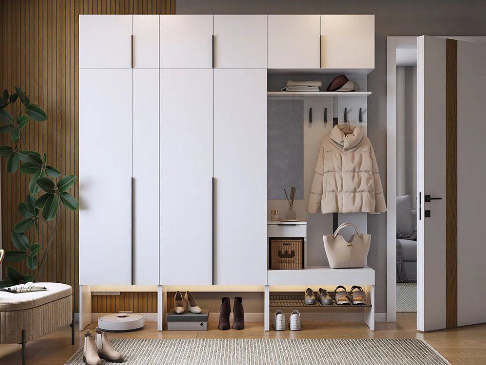 Крючки для одежды обеспечивают удобное место для размещения верхней одежды и аксессуаров, а выкатной ящик предоставляет дополнительное пространство для хранения мелочей. Сетчатая полка для обуви позволяет аккуратно разместить обувь, обеспечивая вентиляцию и легкий доступ.