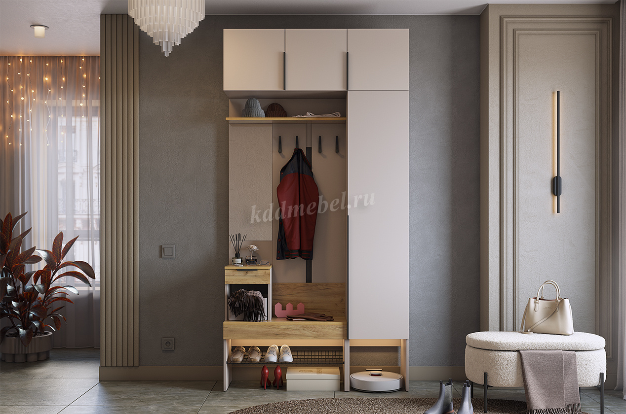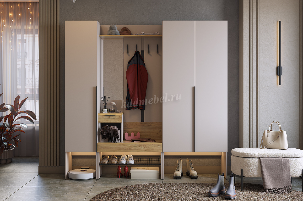 Шкаф оснащен накладными петлями с доводчиком от Боярд, которые обеспечивают плавное и бесшумное закрывание дверей. Наполнение в виде полок предоставляет удобный доступ к одежде, позволяя легко организовать внутреннее пространство.