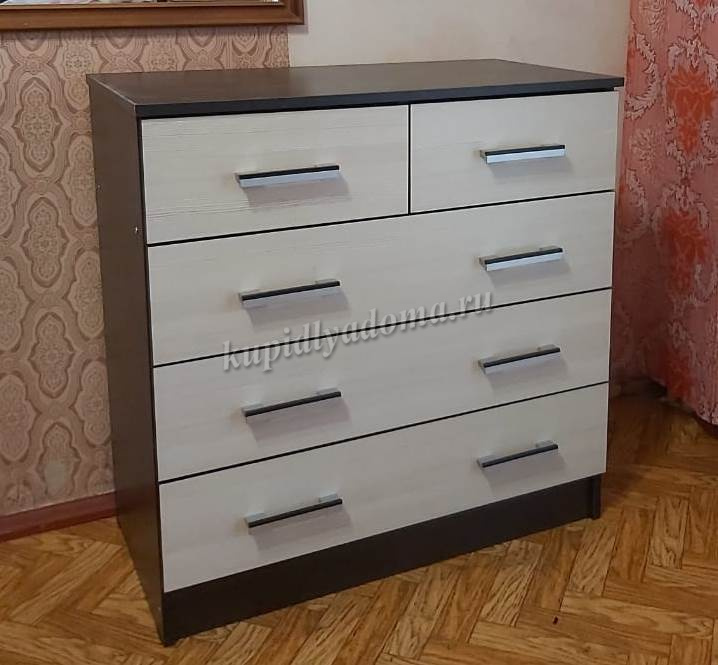 Комод оснащён пятью выдвижными ящиками (3 больших и 2 маленьких).