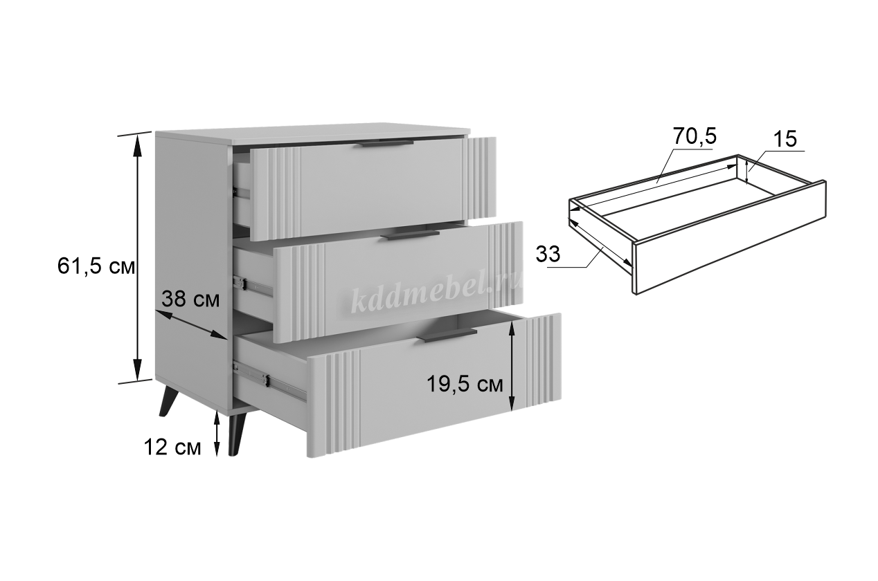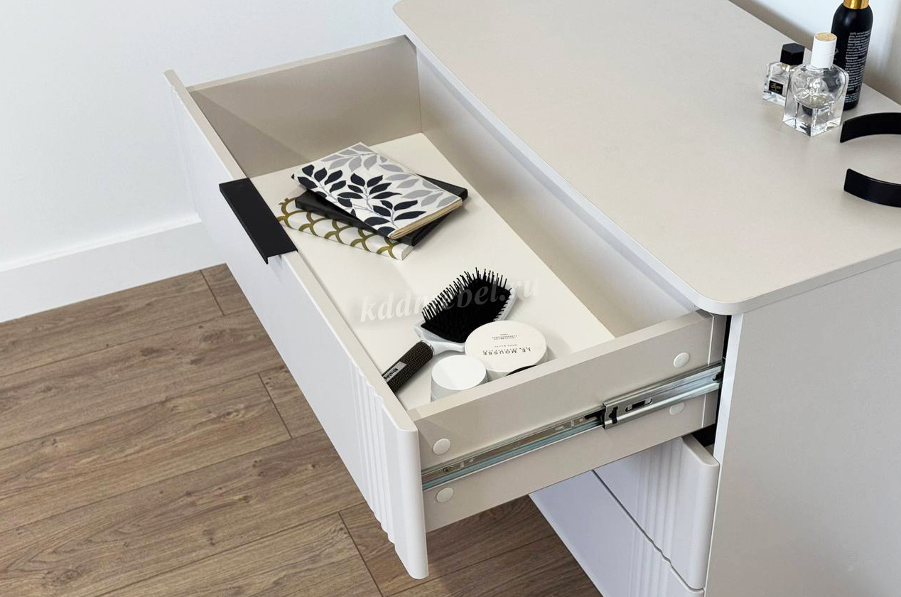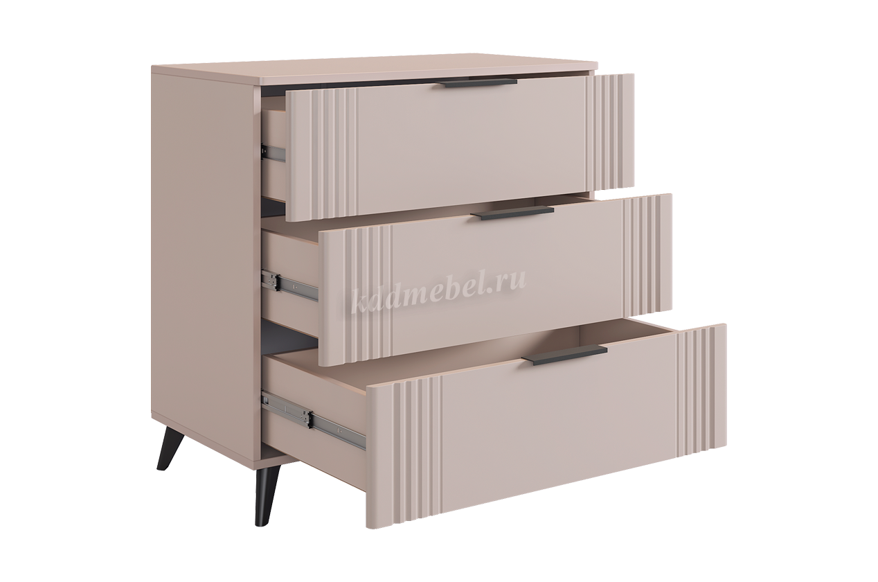 Комод изготовлен из качественных материалов: корпус выполнен из ЛДСП, что гарантирует прочность и долговечность, а фасад, выполненный из МДФ в плёнке ПВХ, не только выглядит эстетично, но и защищает комод от повреждений. Особое внимание заслуживает фрезеровка фасадов, которая придаёт изделию изысканный вид.