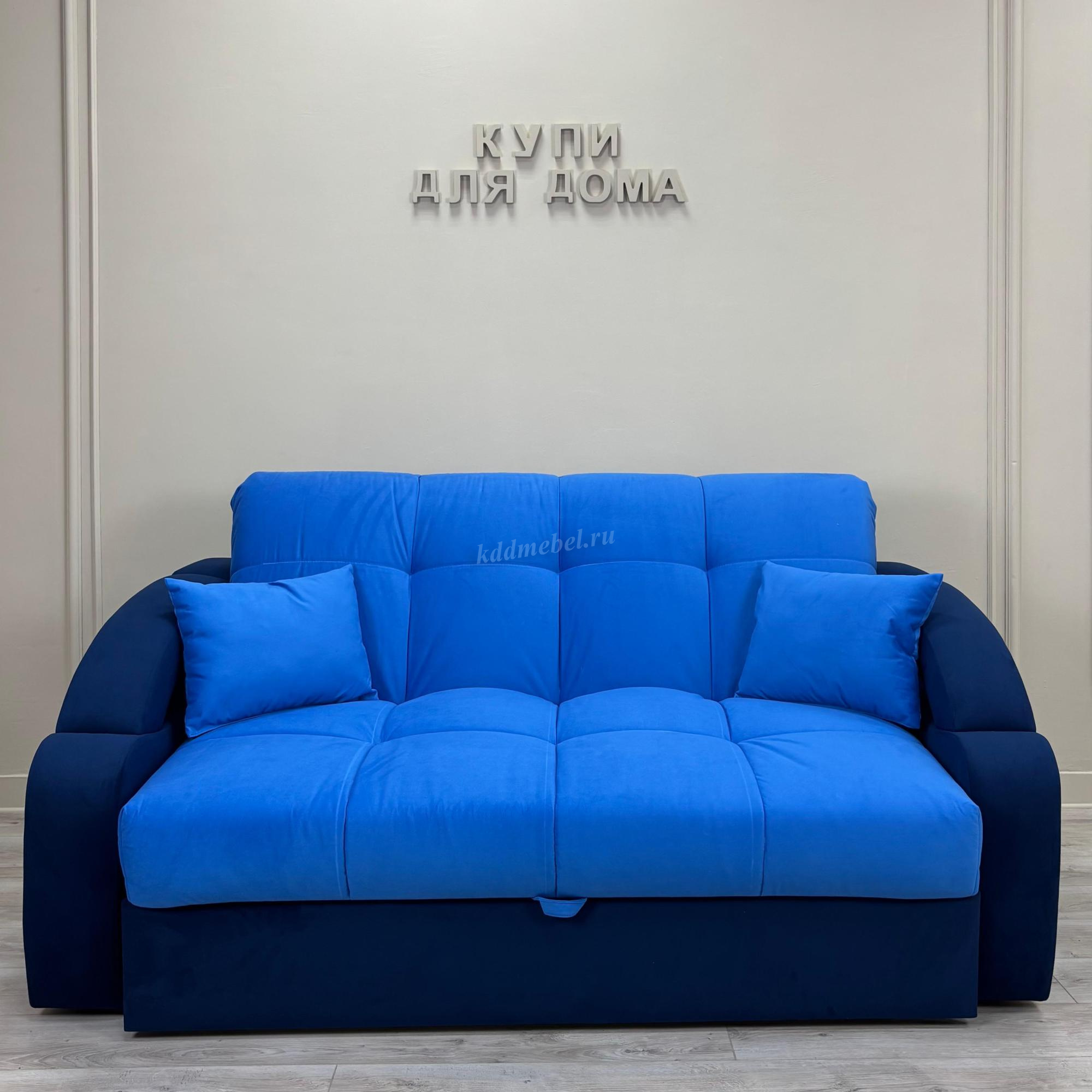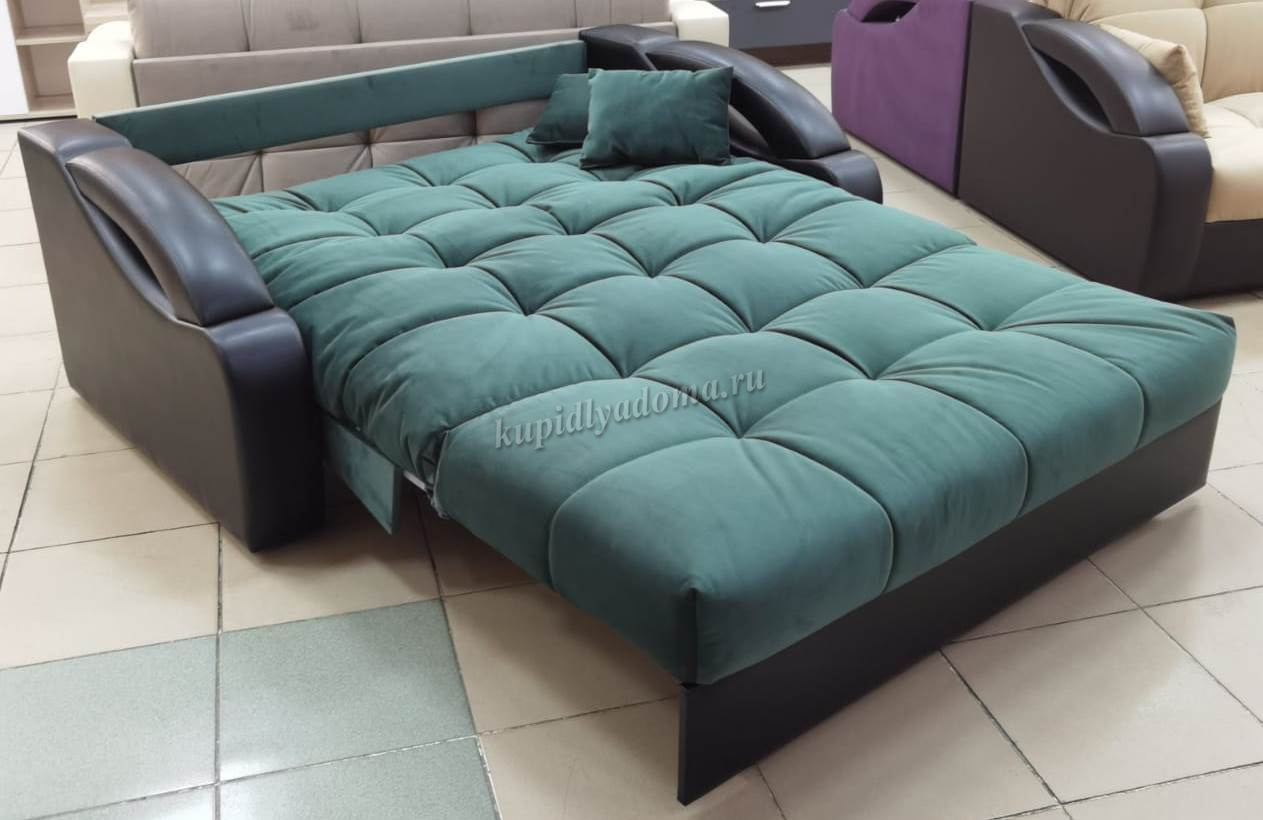 Стильный современный диван. Мягкие дугообразные подлокотники. Ровное спальное место. Возможность использования в качестве центрального объекта интерьера. В основании спального места металлический каркас с поддерживающими деревянными латами и механизмом трансформации «аккордеон». Матрас на эластичном ППУ. Съемный чехол спального места. Спальное место формируется следующим образом: цокольная часть сиденья выдвигается вперед до упора, спинка, состоящая из сложенного листового пенополиуретана, раскладывается. Для трансформирования не требуется расстояние между стеной и диваном. На фото показана модель дивана, расцветку возможно сделать под заказ или выбрать по наличию на складе. Цена может меняться в большую или меньшую сторону, в зависимости от ткани.