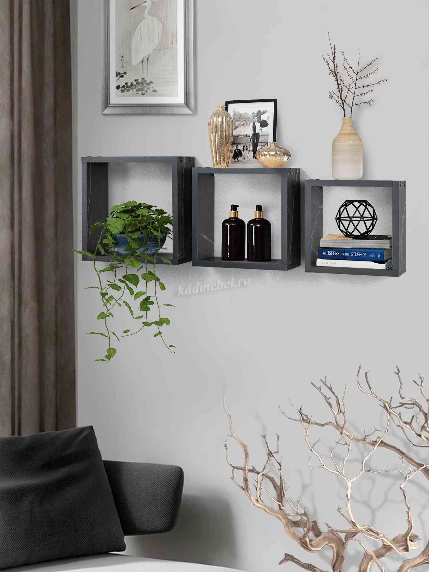 Модель состоит из трех полок: размер 30х13х30 см,27х27х13,24х13х24 см и выполнена в цвете камень пьетра.